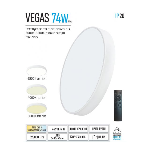 גוף תאורה צמוד תקרה VEGAS. קוטר 40 ס"מ.גובה הגוף 60 מ”מ ומגיע במגוון גדלים, הספקים וצבעים. כולל שלט עם פונקציית CCT לבחירת גוון אור רצוי מ- 3000K ועד 6500K, כולל דימר באמצעות השלט לקביעת עוצמת האור הרצויה OMEGA