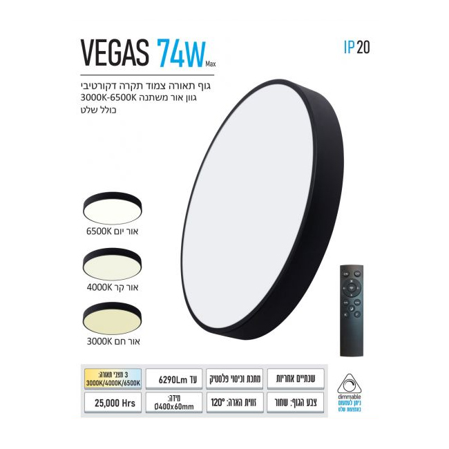 גוף תאורה צמוד תקרה VEGAS. קוטר 40 ס"מ.גובה הגוף 60 מ”מ ומגיע במגוון גדלים, הספקים וצבעים. כולל שלט עם פונקציית CCT לבחירת גוון אור רצוי מ- 3000K ועד 6500K, כולל דימר באמצעות השלט לקביעת עוצמת האור הרצויה OMEGA