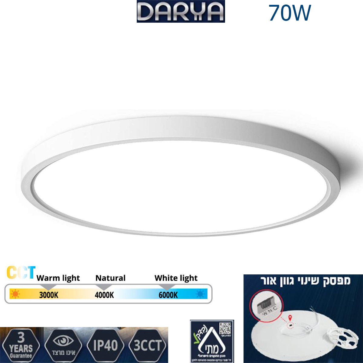 גוף תאורה איכותי ביותר בעיצוב דק במיוחד (2.6 ס"מ בלבד) הספק 70w בעל מתג מובנה לבחירת גוון התאורה לבן/צהוב/טבעי