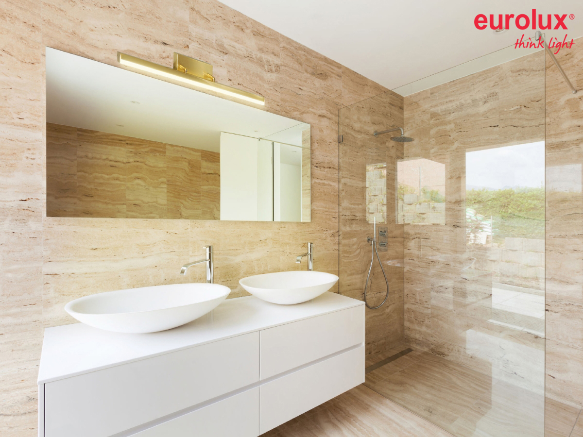 גוף תאורה יוקרתי מאלומיניום,דק,קל משקל ומתכוונן דגם: מוד בגימור ברונזה מוברש מוגן מים IP44 רוחב 60 ס"מ גוון תאורה לבחירה.
