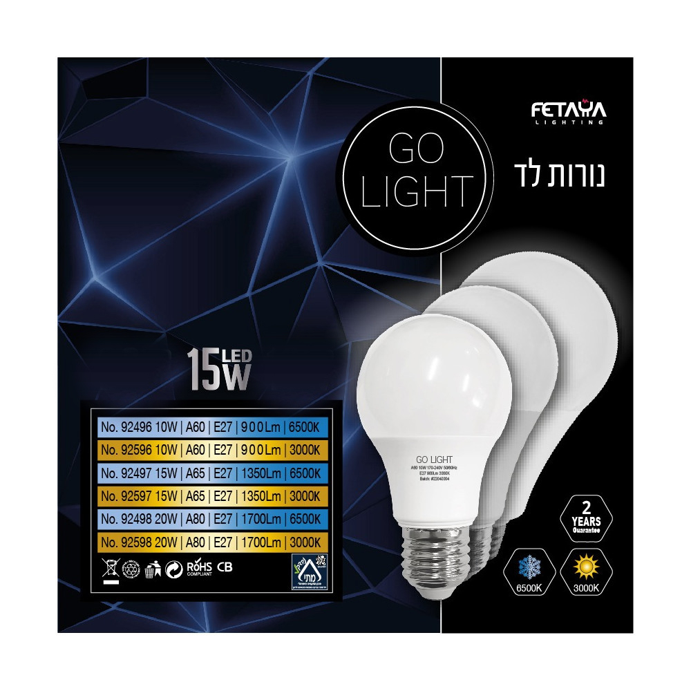 נורת 15W LED איכותית במיוחד ועמידה לשנים! מבית FETAYA סדרת GO LIGHT גוון אור לבן/צהוב לבחירה
